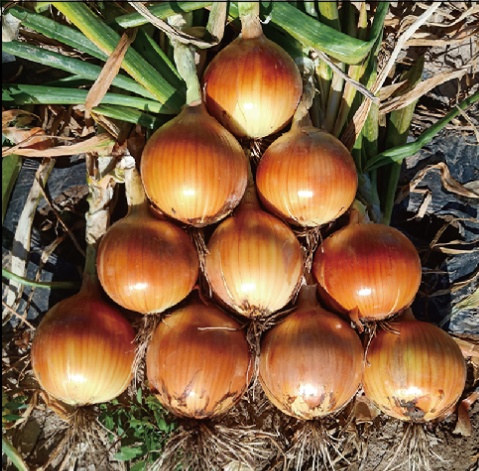 鳞茎近圆球形,较紧实,外皮古铜色,光泽度较好,品质佳。