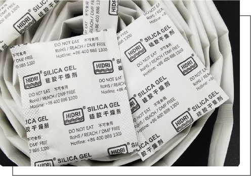 HIDRI硅胶干燥剂选用优质硅胶原料,经过多个工序的层层筛选确保每个硅胶颗粒洁净无尘,粒粒均匀,多种包装材料可选——爱华纸、复合透气膜、杜邦纸。