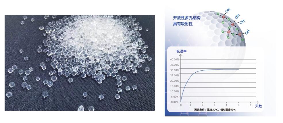 硅胶是一种高活性吸附材料,属非晶态物质,其化学分子式为mSiO2•nH2O,不溶于水和任何溶剂,无毒无味,化学性质稳定,通过SiO2独具的多微孔结构形成毛细吸收和凝结作用来强力吸收水分,吸湿后不潮解。