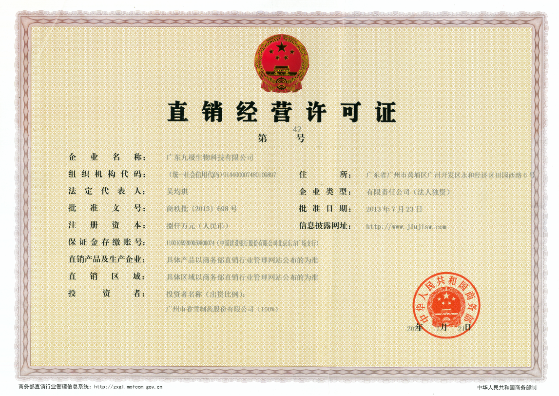 2013 年 7 月,广东九极生物科技有限公司(简称“九极”)获得直销许可,成为国内第 40 家获批直销企业。自此,九极发展迈入规范化、系统化的发展阶段,为企业服务更广泛人群、实现更远梦想,奠定了坚实基础。