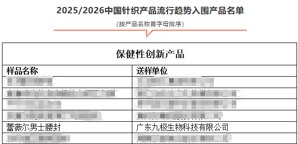 8月,中国针织工业协会官方公布第十届中国针织产品流行趋势入围名单,广东九极生物科技有限公司旗下蕾薇尔男士腰封荣获“保健性创新产品”奖项。