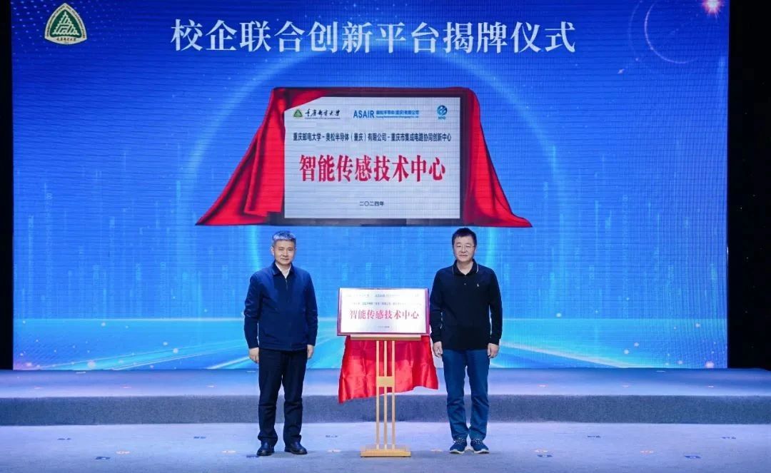 会上,重庆邮电大学党委书记李林、奥松半导体(重庆)有限公司董事长张宾为校企联合创新平台——“智能传感技术中心”揭牌。