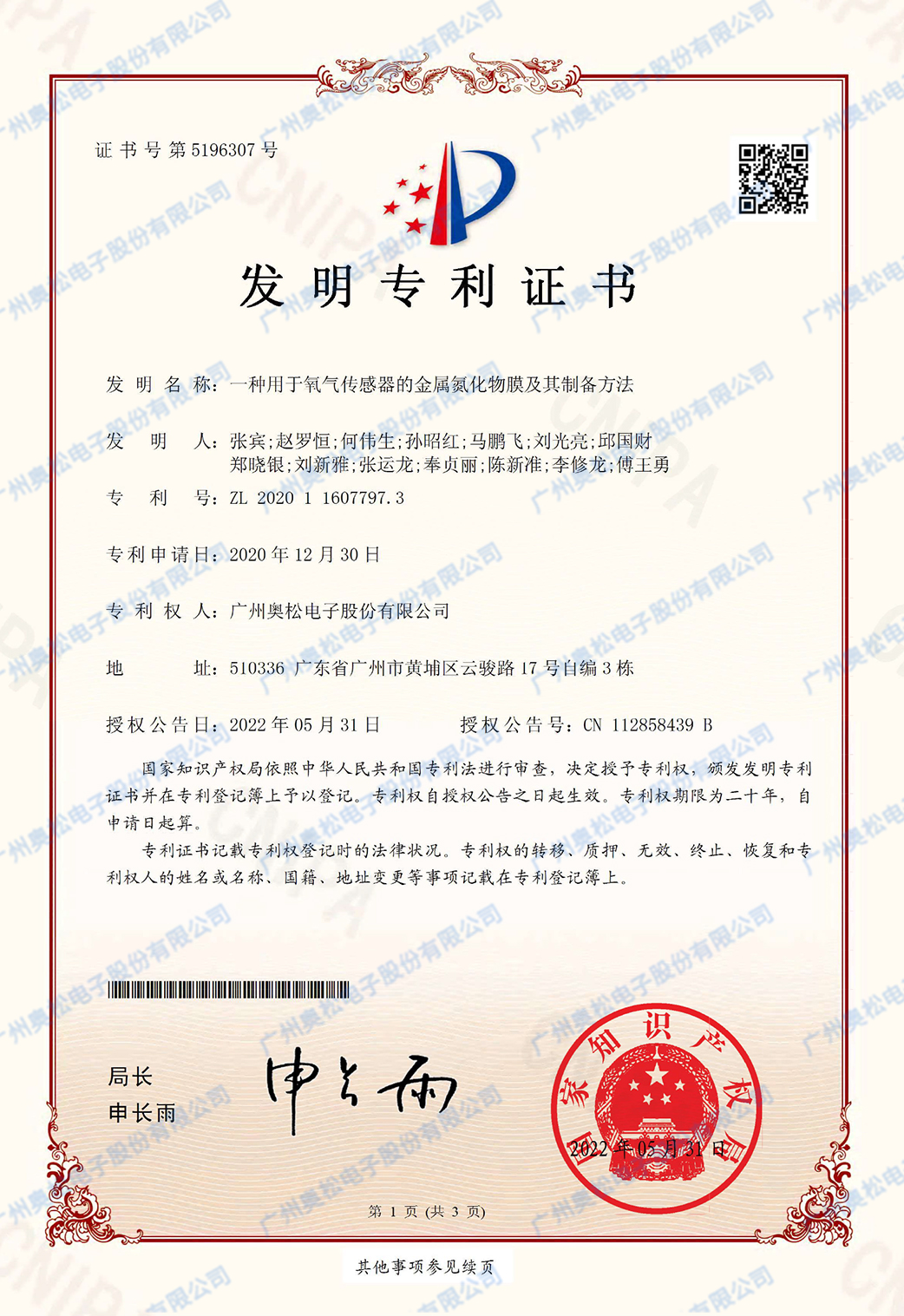 一种用于氧气传感器的金属氮化物膜及其制备方法