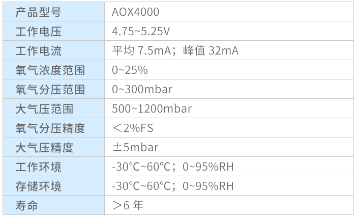 AOX4000工作电压为4.75~5.25V,平均电流为7.5mA,功耗低;产品非常稳定和环保,不含铅或其他任何有害物质,因为氧的发光猝灭具有很高的选择性,因此与其他气体的交叉灵敏度小,几乎不受其他气体的干扰。