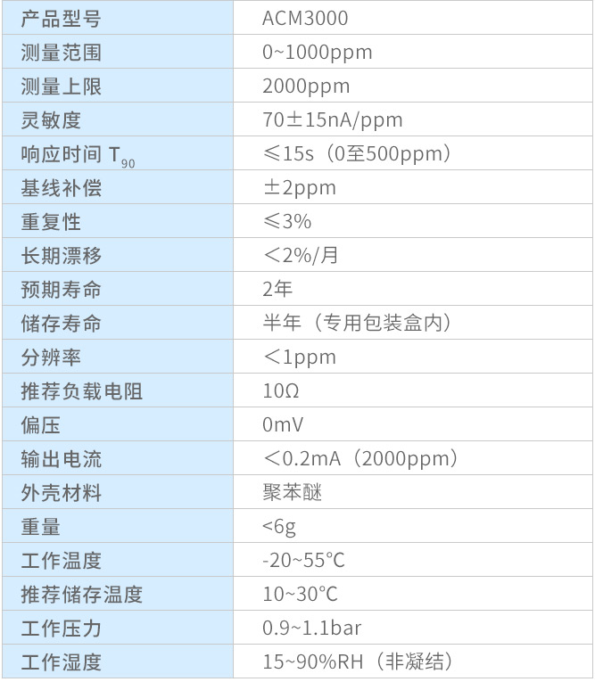 ACM3000是三电极传感器,引入了参比电极,用于控制传感器反应电压,使传感器可以在最佳的电压发生反应,灵敏度高达70nA/ppm,可在15秒内进行响应,及时提醒人们采取措施防止一氧化碳中毒。